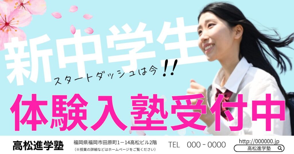 春らしさを演出するため、桜のイラストを取り入れ、新しいスタートへの期待感が伝わるよう、中学生が走り出す写真を使用しました。