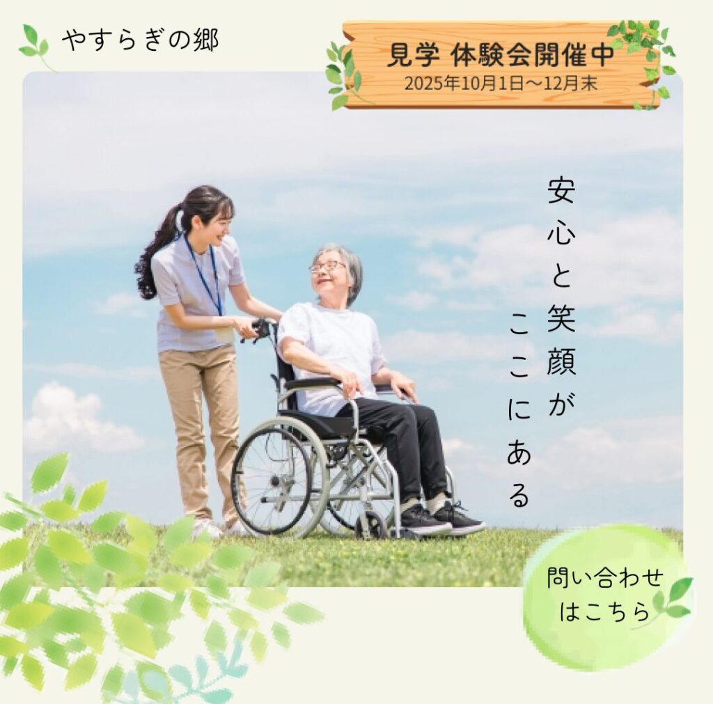 青空のもと、スタッフと利用者様の2ショット写真を中央に配置し、施設の雰囲気や安心感が直感的に伝わるようにしています。